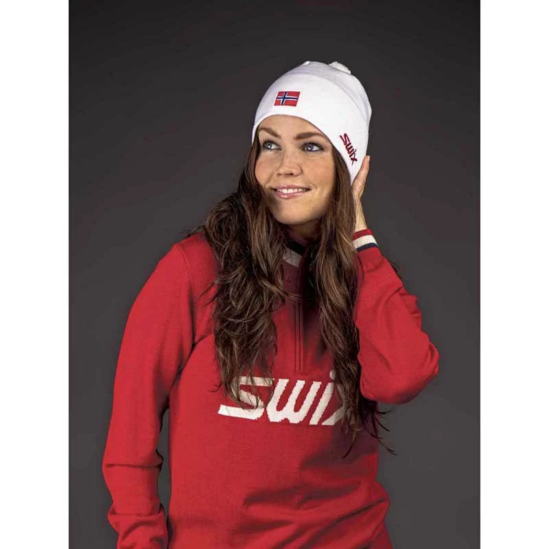 Classic Swix cross-country ski hat with flag for Tradition hat w/flag is a classic cross country ski hat with flag. The hat is warm, made from a fine, light wool-acrylic blend. The fit has been redesigned and improved.