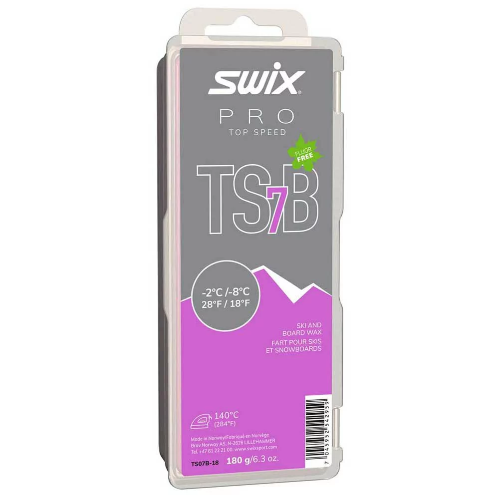 -2°C to -8°C (28°F to 18°F). TS7B is a versatile wax suited for normal winter conditions below the freezing point. Its hardness makes it convenient to work with and easy to get a good end-result. The solid lubricant additive reduces the friction in cold conditions and in contaminated snow. It’s a very popular wax both in alpine and cross country and has shown good properties on artificial snow in addition to natural, transformed older snow. TS7B can be used as race wax alone, but is often used as a base for top coats. Recommended iron temp: 140°C (284°F).